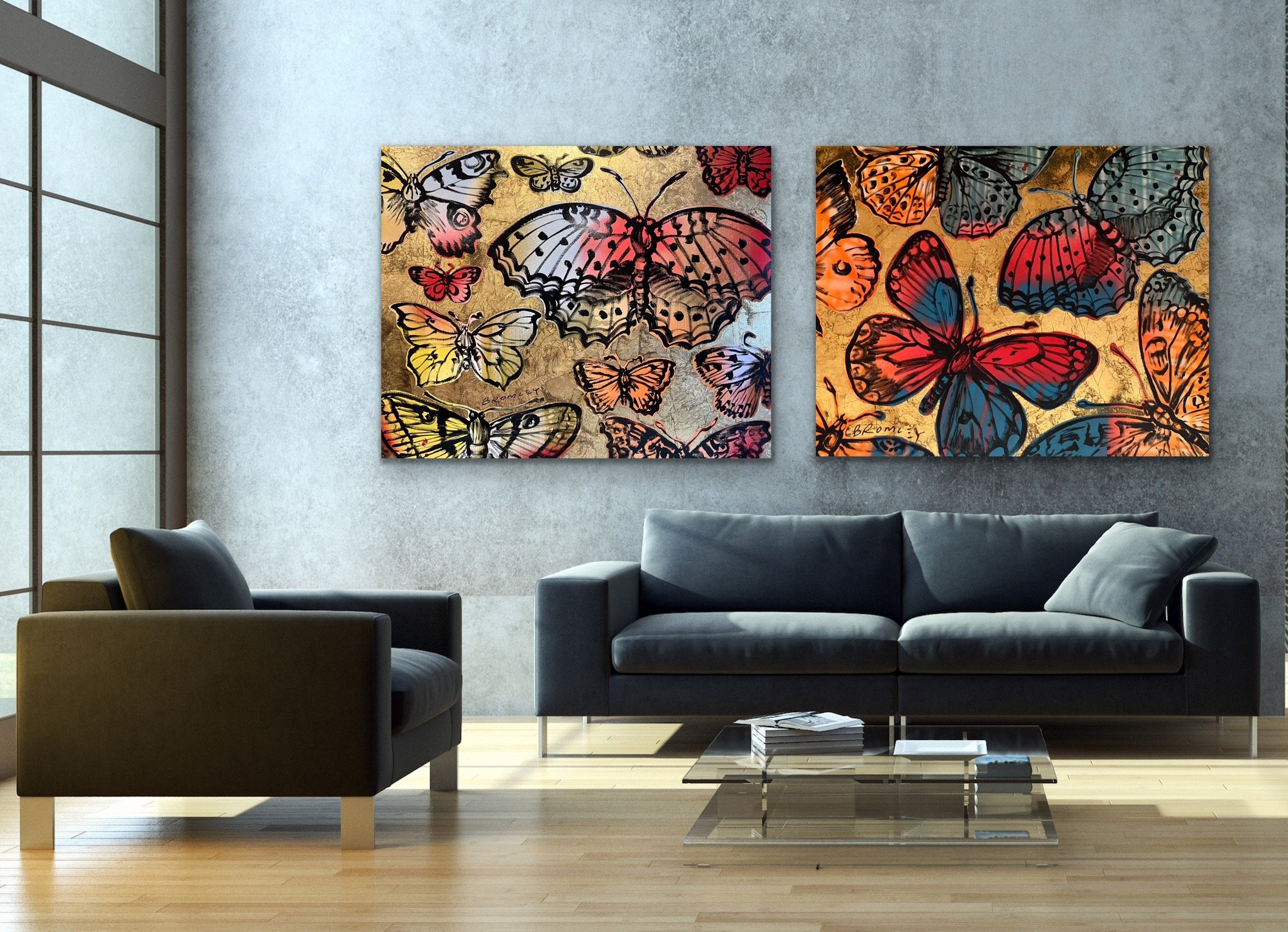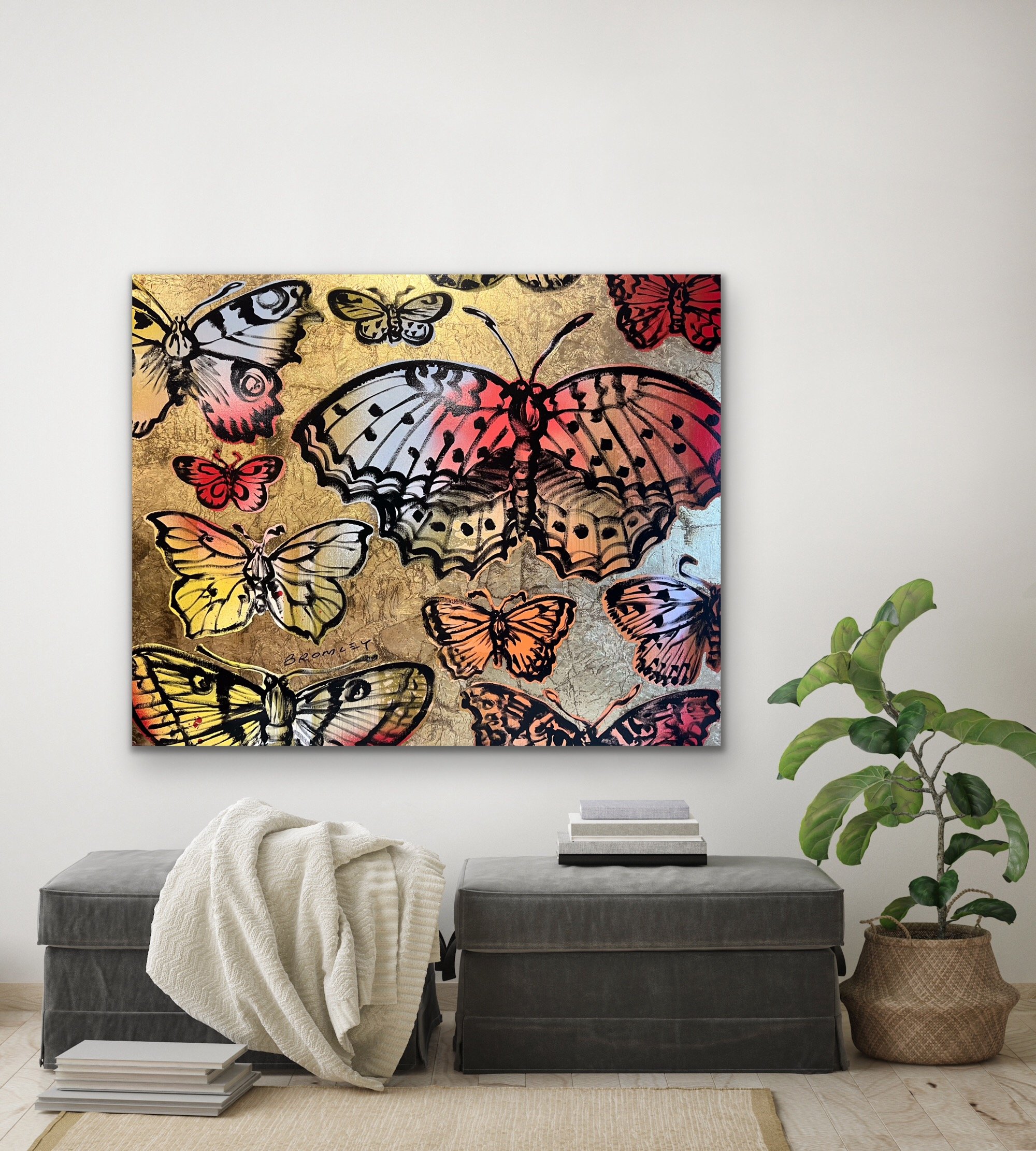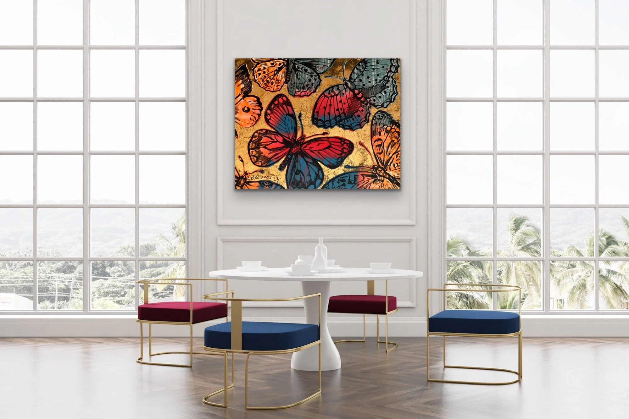 Bromley artworks work around several different sizings placing these ‘gold gilded rainbow butterflies’ in the largest range of sizes offered. This 1.5x1.2 represents some of Davids most striking works. Certificate of Authenticity’ available with every purchase, never been used, Brand New.