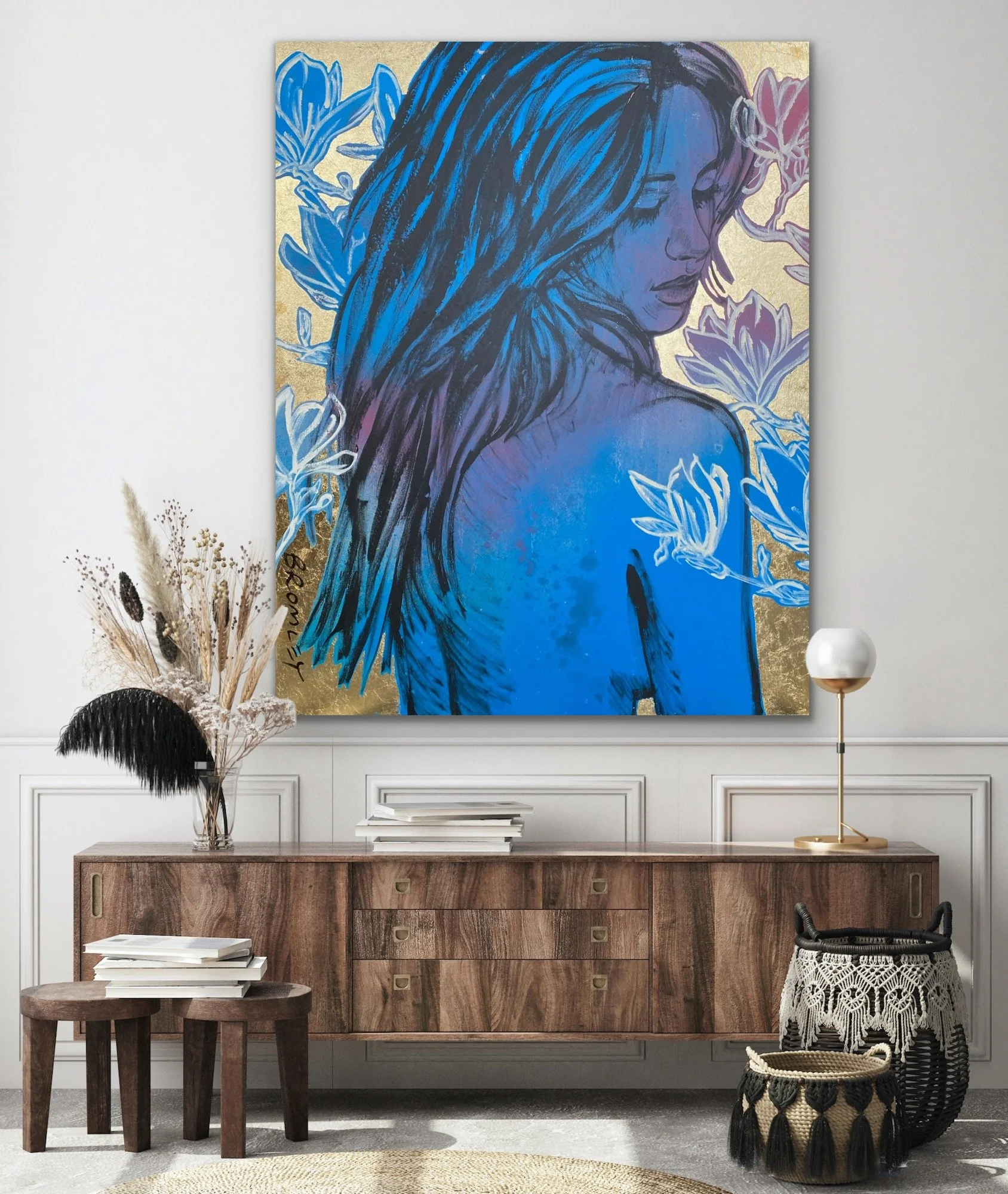 ‘Jessica in flowers’ is perfect for that sunshine coast vibe, with her surfy touch, ocean blue’s and gold gilding, she will make the crowning jewel of any space.